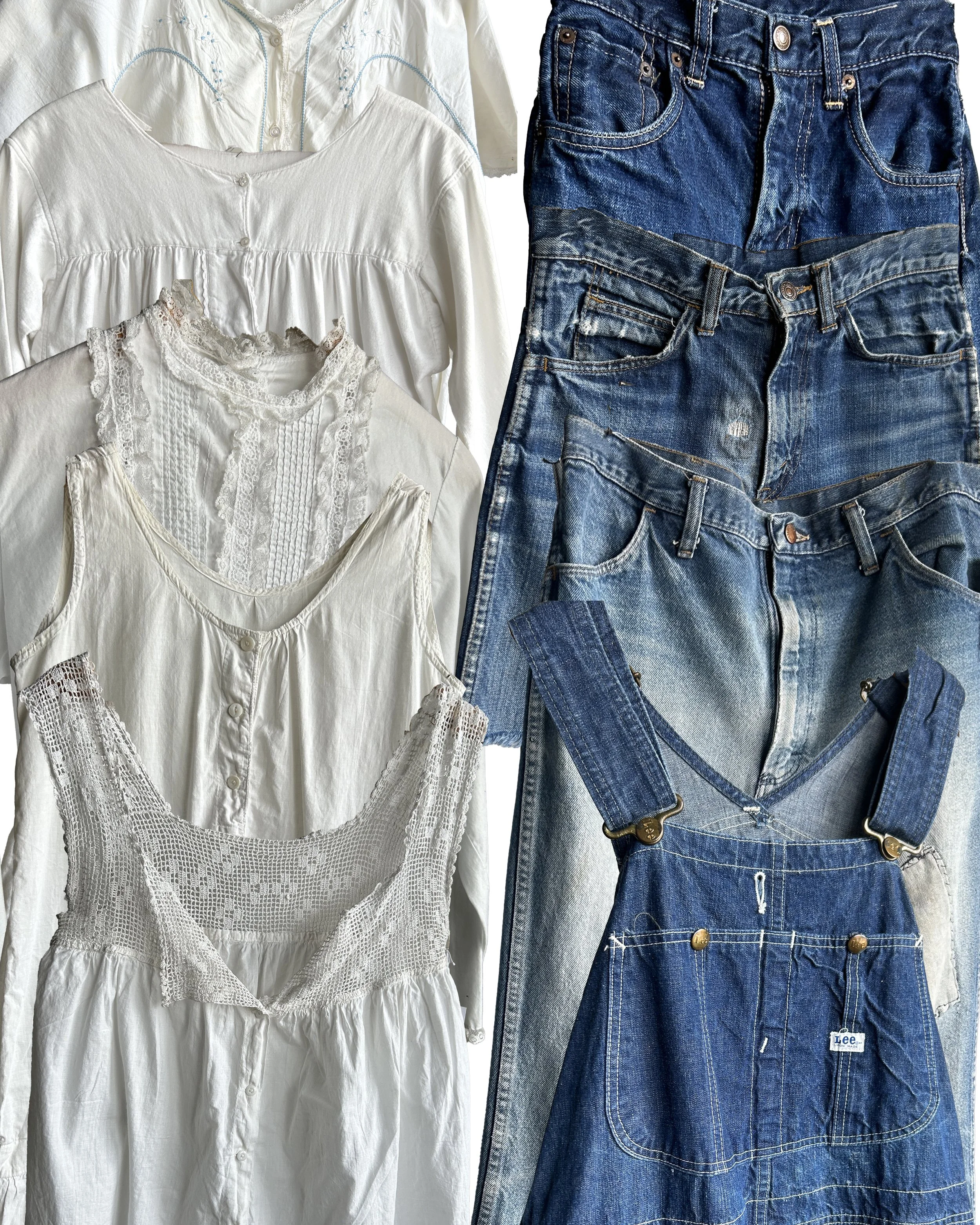 200+ Lots of vintage clothing- antique white cotton garments, jeans, overalls, mens shirts, and more!