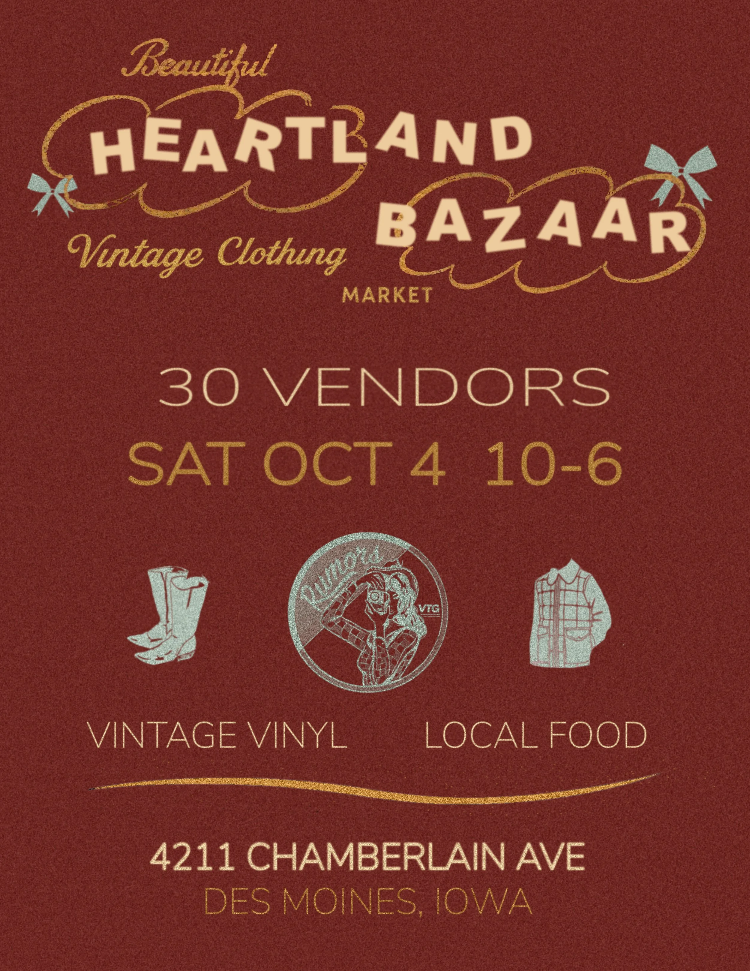 Our bi-annual vintage clothing market featuring 30 unique vendors is held in the parking lot adjacent to Rumors (4211 Chamberlain Ave Des Moines, Iowa) Each booth offers its own unique curation of vintage clothing, accessories, jewelry and decor. Whether you’re looking to stock up on t-shirts from $5-$10 buckets or searching for that one rare, quality item that fits you to a T, Heartland Bazaar is always a fun shopping experience. Eras represented range from early 1900’s- early 2000’s.